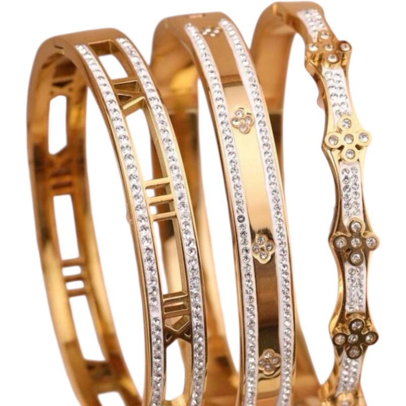 Radiate timeless luxury with our Golden Luxe Bangles, available individually to match your unique style. Crafted from tarnish-free stainless steel and finished with dazzling CZ stones, each bangle brings a distinct design—from Roman numerals to delicate flowers—perfect for stacking or wearing solo.